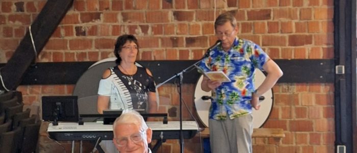 Frau Heiles und Herr Gallo sorgten an der Theke mit kühlenden Getränken für Erfrischung. Vor dem „Festschmaus“ unterhielt Herr Lippe die Anwesenden mit zwei Gedicht-Beiträgen.